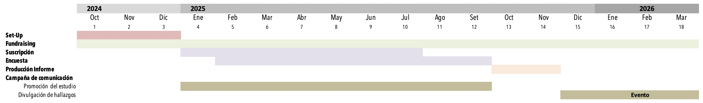 Campaña de divulgación de los hallazgos - Mes 15 a Mes 18. Entrega del informe completo a las organizaciones participantes del estudio y divulgación de una versión resumida a través de diversos medios.